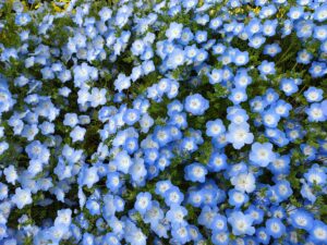 ネモフィラというと、茨城県ひたち海浜公園での一面の青い花をインスタなどでよく見るが「茨城県までは行けないしなあ。でも一度は青い花の絨毯を見てみたいものだな」と諦めていた。